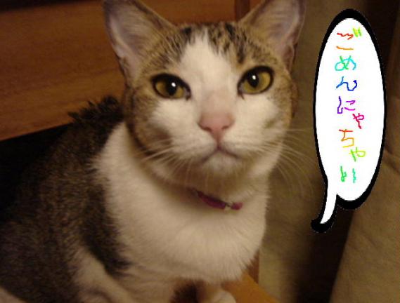 こんにちにゃ ぴよですにゃまた Akiままが「せーたー」を出してきたにゃ しつこいにゃ!うまくうごけにゃくにゃるから いやにゃのに・・・また着せられちゃうのかにゃ? やだにゃ・・・・・・にゃ? ちがうのかにゃ?あれは「せーたー」じゃ にゃいのかにゃ?くんくんにゃ! やっぱりぴよのにがてにゃ「せーたー」だにゃ!!こんにゃもの~~~「きっくきっくがぶがぶの刑」だにゃ!!きっくきっく♪ がぶがぶ♪ きっくきっく♪ がぶがぶ♪きっくきっく・・・?にゃ!Akiままが 泣いちゃったにゃっっっっっごめんにゃ ごめんにゃこれ Akiままがつくったんにゃよね?ぴよがわるかったにゃこれからは「せーたー」となかよくできるように がんばるにゃ!でも・・・