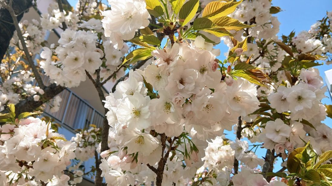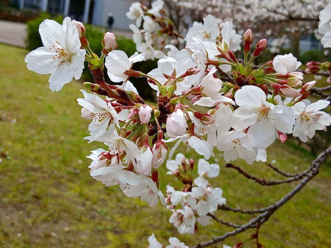 晴れたり曇ったりの日でしたが、大阪も満開を迎えて、マンションの中の桜も満開~!遠くまでお花見に行かなくても、近くで充分ってところ、たくさんありますよね。こんなにきれいに咲いてても、見ている人もなく、ちょっと寂しい風景でした。今年は珍しく、ソメイヨシノが咲いてる時期でも、まだ紅スモモの花が残っていました。こちらはソメイヨシノじゃないのかな?まだ蕾が多くて、咲いてる花もソメイヨシノよりも薄ピンク。蕾の色もピンクが濃いですね。樹全体がまだこんな感じなので、満開までにもう少し日にちがありそう。こちらは今日の帰り、こども園の園庭に咲いてる桜。満開です。私は列席しませんが、明日は入園式です。桜の花の下で記念撮影できますね。でも、来週からしばらくの間、朝はギャン泣きでしょうねけーやんの保育園生活は、初日から喜んで行ってましたが、息子は2週間ほど、毎朝玄関のドアノブをつかんで離さず、大泣き。その手を引き離して、保育園へ連れて行ってたこと、もう40年近く昔のことになりました。