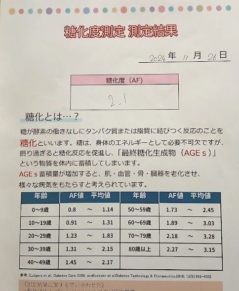 去年の秋、健康オタクの遊星は体力測定や体年齢などを調べてもらい、その中で、言葉は知っててもイマイチ、数値がよくわからなかったのが、「糖化度」(体のコゲ)以前の会社にいるときから「糖化」は習ってて真皮層の糖化によって、肌は老化するのはわかってたけど、自分がどのくらいコゲてるのかは計ったこともなくて、当時はそれほど興味もなかったわ。でも去年の秋、その糖化度を計ってもらいました。腕を測定機に乗せて、その結果を見せてもらったんです。ざっくりとした数値が書いてあったので、いいのか悪いのか、よくわからなかったんだけど、昨日、NHKの番組「糖化のトリセツ」でわかりました!糖化度21って、52歳~!え?実年齢は何歳だって?それは言えないよ、一部の人は知ってるけど。10歳、15歳以上若いってことだよ。食事や睡眠、運動に気をつけてるけど、唯一、ダメなのが甘いものが大好き、ってこと。この検査を受けたときも、栄養管理士から「おやつなどは2日に一度程度にされたらどうですか」って言われてて、そんな人の楽しみを奪うようなこと、言うなよ・・・と思ってたんだけど、健康維持のために、1日1回にしとこうかねぇ・・・え?今はね・・・午前と午後に1回ずつ~~