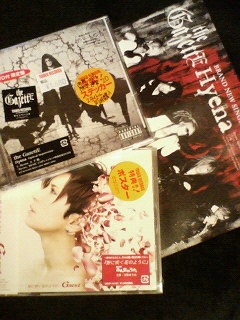 今日はかなり天気良かった…んで予定道りお買い物。フロッピー、CDディスク、USB、光沢紙…作品制作に必要なものが沢山ありましたから。ふと気が付けば今日はダブルG(Gackt&ガゼット/笑)のフラゲ日じゃん…!(気付くの遅い)って事で勿論買ってきました。Gacktは通常盤、ガゼは初回限定盤の方。Gackt氏はジャケットが綺麗だったからやっぱついつい買ってしまった―!!手が勝手に…。(ぇ)まだガゼの方しか聴いてないですけど…折角PVの方買ったのに今回の正直微妙;公式試聴のクリップのが勝ってて、いざフルで見たら期待ハズレってカンジだったかな。折角Hyenaってタイトルなんだから、エキストラに特殊メイク施したりしたらもっと良かったんじゃない?とか。アレじゃあ普通過ぎる…なんて言うかもっと侵食感が全体的に欲しかった。Gacktの方は買ったらポスタ―貰えました。特大Gacktたま…ヤバイ、素敵個人的に今回は詩よりもこのヴィジュアルが好き。(笑)Gackt氏、次は激しいの頼みますよぃ…!!w