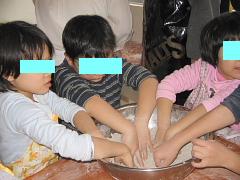 母の友人に誘われ、そば打ち教室に行ってきました♪粉まみれになるだろうと幼稚園のスモックを持って行っていたのですが、みんなと違うのが嫌な息子くん、もちろん却下。。。服はお腹のところ、当然真っ白に。。。画像は、そば粉に水を混ぜポロポロにしているところです。子どもの手が4人分!?混み合ってます。まとまった生地を麺棒でのばしたり、そば切りもやらせてもらいました。出来上がったおそばは、だいこんそばと鴨南そばに。だいこんの方はちょっと辛くて息子くん、食べられず。。。鴨南そばは、鴨がかみ切れず、途中でギブアップ。。。しょせんは、大人の味!?母的にはとってもおいしかったです♪