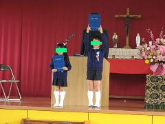 卒園おめでとう!!幼稚園、3年、終わりました!!(成長したのか、どうなのか、、、)母、ビデオ係。園児入場!息子くん、順番早かったもんだから、ビデオ間に合わず!?証書をもらった後に一言。おべんとうありがとうと言ってもらえました。てっきり、将来の夢の発表かと思ったけどお弁当も幼稚園で終わりなので、優先してくれたらしい。ありがとさんでした。証書授与のあとは、皆勤・精勤賞の授与。ごめーん!!息子くん。年中・年長の2年間、病休は1つもなかったんだけど家の都合で4日以上休んでおります^^;それにしても3年間皆勤の子がいてびっくり!?式中、「もーーーーっ!」と叫ぶ声が。。。明らかに息子くんの声。。。誰かとちょっかいのかけあいこしてたのか。おいおい、最後までですか。。。あれだけ釘をさしておいたのにねえ。。。↑教室に貼ってあった写真。 「地球のことを真剣に考えている○○くん 歌まねやおもしろいことをいっぱい話してくれました」 と先生からのコメント。 息子よ、そんなに地球のこと考えてたんだ