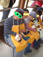 幼稚園のお友達と海の中道へ行きました♪こちらではレンタサイクルできるのです。行ってみてビックリ!平日は乗り放題?とのこと。通常は3時間410円です。(大人料金)みんな、ヘルメットをかぶってレッツゴー!息子くん、このところ、おじいちゃんと自転車乗り回してたのでぐんぐん先を走って行きます。海浜公園の中には、ちょっとした動物園もあります。 モルモットを抱っこできるところがあるのですが、、、息子くん、以前もそうだったけど、緊張気味。エプロンをつけてひざにモルモットを乗せるんだけど動きません。ていうか、動けない!?母的には笑えます。モルモットを抱っこするのは、気分的によいようです。かわいい♪と言っておりました。
