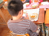 初めての参観は給食参観でした♪水曜から給食が始まったのですが息子くん、苦手な献立が続いてたのです。でも、聞いてみると、がんばって食べたって言ってたのでへぇー!と驚いてました。本日の献立は、スパゲティナポリタン、海草ツナキュウリサラダ、パン、牛乳、りんごゼリーでした。 苦手なのはこれ↓ グリンピースときゅうり。息子くん、豆類嫌いなんだよね~幸か不幸か1個だけ入ってました^^;きちんと1個、しっかり残してたけど「今から食べるよ」とがんばって食べました!もちろん、きゅうりのサラダもね。家では絶対食べません。無理矢理食べさせようとしても吐き出すのよ~給食「様々」です☆ふと正面を見ると、、、↑クラス目標「ぽかぽか」をぐるっとかこんで子どもの絵。図工で「すきなもの」というテーマで描いたらしい。よく見ると、ほとんどの子は教科書にあるようなほのぼのとした絵を描いているのに、、、息子くんの絵はこれ↓ゴーイングマイウエー!独自の絵を描いております!!一体、これなに???何の物体!?いなご!??バッタ???後で息子くんに聞いてみたら、、、ロボットとのこと。それから、これ↓おばけの絵。家に帰ってきてから、何を描いたか聞いたら「こわいもの」を描きたかったらしい。こ、こわいっちゅーよりもかわいいんだけど!?萌え~どっちかっていうと、上の絵の方が怖いんだけど^^;それから、自由帳にはこんな絵を描いてます。まちの絵だそうです。細かい絵を描くようになったね~にほんブログ村こちら↑に参加してまーす。子育てブログが集まってまーす♪