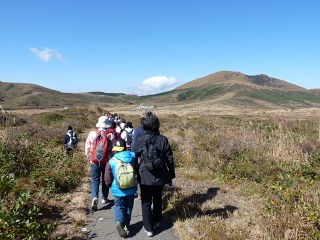 今年も文化の日、阿蘇ウォーキングに行って参りました♪ かなり冷え込むと思って厚着で行きましたが お天気はすごくよく、登っているうちに暑くなりました。 去年の「大観峰から内牧温泉」までよりは、楽ちん♪ 同じ10キロでも景色や道が違うからですかね~ 今年は2回目の10キロウォークなんで慣れたのかな^^今回は、阿蘇中岳へ登り下りてきてから、杵島岳方面~草千里1周して10キロ。 でも、残念ながら、中岳へは噴煙の向きが多かったのか向きが悪かったのか、有毒ガスの危険信号が出たため中止。 ロープウエェーに乗るのを楽しみにしてたんだけどね~ その後、風向き?によっては、解除されてたようで車が登って行ってました。 ↑(草千里の駐車場から中岳を望む・けむりがあがってま~す) ↑ 初めて野生のりんどうを見ました!! ↑ 前方の左手の山を登ります(低い方^^;) 奥の方の山も登ってよかったけど、息子くんの抗議でパス^^; ↑ 展望台から草千里を望む ↑ 展望台を下りて草千里へ向かう。前方に中岳が見えます。 杵島岳には登らず、山の山頂にある展望台から草千里へ。 左周りに1周します。その前に、、、 実家の母が、息子くんを馬に乗せたかったようで、、、^^; 恐がりなんで嫌がるかと思ったら、乗りたいと言い出したのでビックリ!? さすがに乗ろうとしたら、気がひけたようですが、乗る手伝いをするとその後、すんなり。よかった~5分で1200円なり~ (ツアー客だったせいか100円引いてもらいました^^; ツアー会社の話では割引なしだったんだけどね) 前回の福岡シティウォークほどぐずらなかったけど 最後の方は、もう歩きたくない!と言いだし、草千里1周から一人、離脱。 半周くらいから真ん中を通って戻りました。 一人で寂しがるかと思ったけど、がんばって歩いたようです。 たまには、こうやって一人でがんばらせるのが必要!なんて思ってます。甘ちゃんやもんねー コースは画像の右、小高い山を登っておりるか、 山の向こう側を通るようになっています。 ↓ 私は、小高い山に登り、望遠で一人歩く息子くんを撮影。 離脱した息子くん、結局、1周するのとそれほど変わりませんでした ↑スタンバイしている馬さん。息子くんが乗ったのは白馬のゆみちゃん^^; 馬は選べません。何故か白馬に乗せたい実家の母?! ↑ 小高い山から望遠で。小山周り1周コースを。 馬によってはのんびり歩く子もいたんで、 25分以上かかるかもね~ このツアー、おみやげ付き♪ なす・きゅうり1本ずつ、みかん6個、お饅頭など3個、お弁当付きで3980円! 安いです!! 来年も行こう♪ということになってます。 息子くんは、嫌だあ!と言ってますが、もっと馬に乗りたかったなあという息子くんに 実家の母は、来年はもっと長いコースに乗せてあげる♪と人参ぶらさげてます。 このコースは、バスが40台以上出る大ツアー!去年の方もよかったんだけど、今回の添乗員さん、ガイドまでやってくれました♪なんと!中国からの留学生の女性。 前日の確認の電話で、あれ?日本人じゃない?と思ったけど。 なーんのその。日本語、ちょっとおかしいところもあったけど、大変お上手。2,3曲歌ってくれました。これまた上手♪ 添乗員さんて、普通、ガイドやってくれませんよね。もう6年くらい福岡にいるそうです。 中国式の指の数の数え方も教えてもらいました。 日本式だったら両手を使って数を数えるけど、中国って片手でできるんですね~ 今年も楽しい、10Kウォーキングでした☆