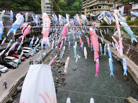 どーーーん! 熊本県阿蘇郡小国町の杖立温泉のこいのぼりです!!GW後半初日快晴!ということで道路は激混み!!我が家は高速道路はあまり使わないので福岡から51号線を南下し、386号線バイパス、210号線→212号線を通りました。車はかなり多かったのですが、流れがよかったですね。でも、いつも休憩する原鶴の道の駅まで2時間近くかかったかも!?すっかりおなかがすいておにぎりと唐揚げをいただきました♪杖立に到着!それほど車多くないかな?と思ったら駐車場入り口はずらっと上下並んでました^^;約30分ほど並んで駐車。本日のメインイベントはこれ!こちらは無料&セルフで使わせてもらえます♪気づいたところだけで2,3カ所くらいありますよ。今回持ち込んだ材料は、、、さつまいも、ジャガイモ、鶏のもも肉、たまご、、、と思ったら、卵持ってくるの忘れてた!!(お皿?ざるを持ってくればよかったな~ 鶏もも肉は直置き^^; 汚れたところは、後でティッシュで拭きました)紙皿・フォーク・お塩ももちろん必需品。というわけで、旅館の温泉卵を購入、1個50円♪殻をむいたたまごはちょっと薄茶色。お味は濃く感じます^^もも肉は蒸しただけなのにおいしかったよ~お塩だけでうまみたっぷり~サツマイモは紅はるかだったかな?甘味の強いおイモなだけにおいしかった!ここについたらまずは蒸しをセットして散策。蒸し上がるのに30分前後かかります。あまり知られていないのか、蒸し場にはあまり並んでませんでしたよ。でも、ゆで卵だけで蒸し場2カ所占領してる人も!?何パック蒸してるの!?ま、そのとき、空いてたから、、、っていうのもあったのかもしれないけどこれはね、、、ちょっとね、、、(>