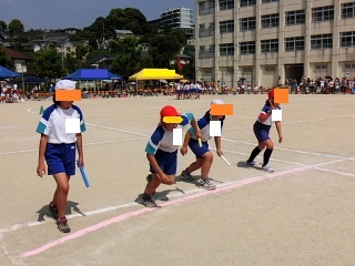 晴天の中、運動会がありました♪ずっと晴れの予報が出ていたので雨の心配はなかったのですがPM2.5、黄砂の注意報メールが連日送られてきていたのでそっちの方が心配でしたね。当日は、PM2.5は大丈夫でした♪息子くんの出場競技はリレー、組体操、騎馬戦。息子くんの学校は5,6年生、2クラスずつで人数少ないので組体操と騎馬戦は合同でやってます。まずは、リレー。走る距離を半周・1周・1周半の中から選べたそうで走るのが不得意な息子くんはもちろん半周希望。その上、スターターでした^^;にぶい息子くんなので大丈夫かな?と思ったけど今年は反応がよかったようです。スタート位置でカメラを構えて高速連写で撮りました♪そしたら、、、この写真。左から二番目の赤帽子ですが。息子くん、もしかしてフライングだった!?でもやり直しのピストルはならなかったのでセーフなんでしょう。家に帰って高速連写で撮ったものを見ていると息子くんの意外な姿を発見!!な、なんか舌出してない!?拡大してみると、、、舌出してる!!!舌を出してる画像が多く、ひっこむ画像は1枚だったのでひっこませるのは早かったもよう^^;走る時に舌を出すなんて!?舌かむじゃん!本人も自分では気づいてなかったですね^^;高速連写おもしろいな~去年は写真撮るの失敗してほとんど画像ありません(TT)息子くんが走る前にいくつか前のレースで練習してたんだけどいつの間にか高速連写モードにしていたようであっという間にSDカードの容量がなくなりいざ撮ろうとした時は、、、容量なしで撮れませんでした(TT)削除しようにもその時間もなく息子くんの順番が来て(TT)しかも1枚のサイズ設定を結構大きいものにしたままで2GBじゃ足りなかったようです。2GBもあれば、SDカード1枚で大丈夫だろうと予備持って行ってなかったんだよね^^;毎年そんな感じのトホホな母です^^;それがあったので、今年は中くらいのサイズ設定にしてリレーの時だけ連写モードに。SDカードも予備を持って。さてさて高速連写でスタート位置で10mくらい先まで撮ったのでこれでOKと思ってたら、、、なんか、短い。。。4,5mくらい???撮りたい長さ分シャッターを押せば撮れると思ってたんだけどそうでもなかった!?説明書見てないので分かりません(TT)にほんブログ村はげみになります^^