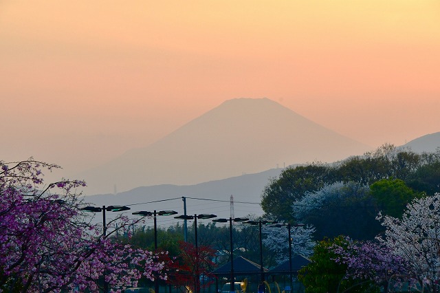 見ると春霞を破って富士が夕映えの中に浮かんでいる。