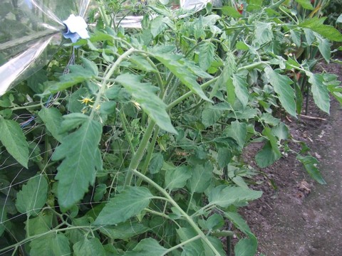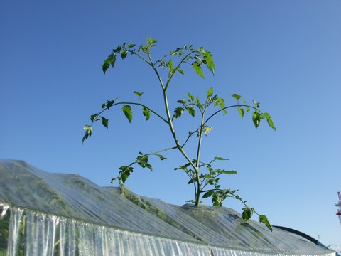 雨よけ簡易ハウスの高さは2メートルですが、桃太郎トマトは激しく成長し、天井につっかえてしまいました。幹の太さも親指と人差し指ではつかみきれないぐらい。すでに収穫は10個、これからまだまだ収穫出来そうです。←ポチッと!ランキング参加中