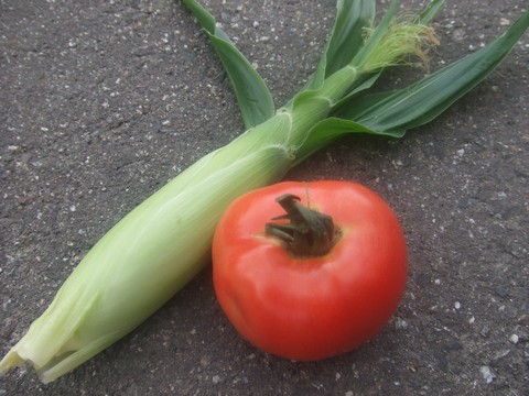 めでたく桃太郎トマト収穫しましたです。中玉ぐらいの大きさだったですが赤くなったので。1番果です。さっそく夕食でいただきました。甘みはまあまあ、酸っぱさもほどよく、上出来、上出来、満足であります。畑にはまだLサイズがたくさん収穫を待っています。一緒写っているのは間引きのちょっと大きめヤングコーンです。楽しみが続きます。←ポチッと!ランキング参加中