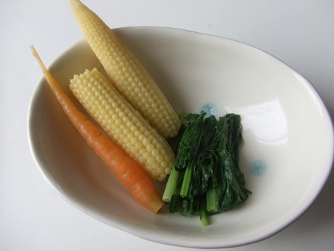 おかずです。量は少ないのですが甘いし香りが良いし、これがけっこう存在感があるのですよ。ヤングコーンとニンジンのおひたし。3日おきぐらいにいただいております。でもこうして写真で改めてみるとウサギの食べ物みたいですね(^o^)。←ポチッと!ランキング参加中