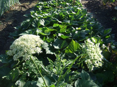 2つ目の人参の花(右)が咲きはじめました。1つ目の花も長く咲いております。地味ですが真っ白で小さくてなかなか風情があります。背景は鳴門金時ですが、すっかり”ジャングル”になってしまいました。畝を完全に占拠しました。横に伸びられなくなって上方に向かって繁り始めています。植え付けが遅かったので収穫はもうちょっと先ですね。11月ごろ?←ポチッと!ランキング参加中