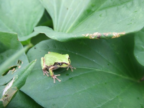 雨が多くて、まだ8月だというのに涼しくなってきましたが、畑にアマガエルが増えました。サツマイモの葉っぱの上でバッタをねらっています。正確には”モリアオガエル”が”オンブバッタ”を補食してくれています。サツマイモの葉っぱがバッタのせいで穴だらけだったので、ちょっとカエルさんに期待しています!←ポチッと!ランキング参加中