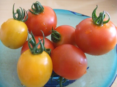 収穫です。ミニメロン初収穫で3個、桃太郎は通算10個越えで3段目まで進みました。イエローオーレも最盛期。茄子と赤いミニトマトは母親の畑から失敬しました!あんまりにもミニトマトがたくさんとれるので、朝から晩までおやつにもミニトマト食べてますσ(^^)。←ポチッと!ランキング参加中