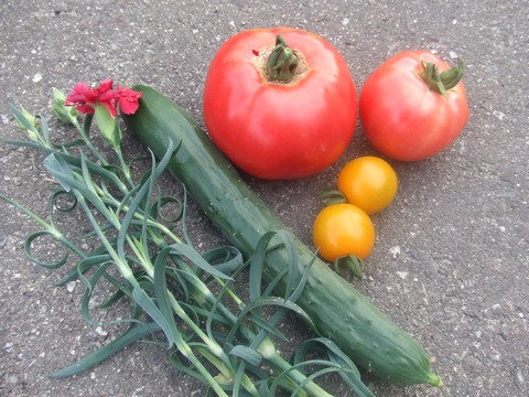 LLサイズの桃太郎収穫です!小さいのもついでに収穫。イエローオーレも収穫。みんな今晩のおかずです。水を押さえた効果で甘いかどうかはたべてから報告します。ただ手に持った感覚的にはすごく重い、比重が大きい感じ・・・期待できますかね?なお一緒に写っているカーネーションは畝の隅っこに植えていたもので、キュウリは母の畑のものでした。←ポチッと!ランキング参加中