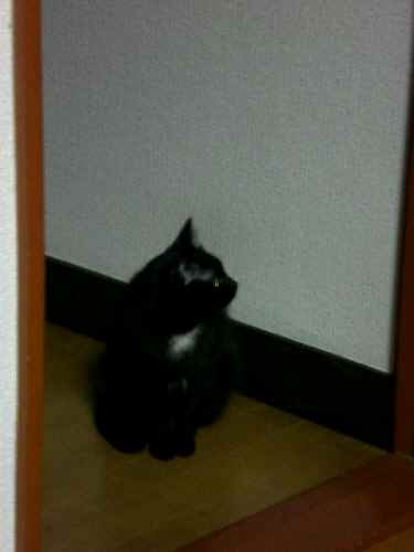 2階から機嫌良く降りてきたぽるがリビングに入ろうとすると、何やらダイニングが気になったようで立ち止まりました。