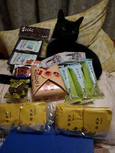 一枚撮ったところでさすがに動いて、お土産の山を払いのけました。