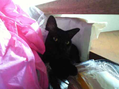 カラーボックスの上にいろいろ積んでいるものを押しのけて、うまいことスペースを作ってまったり。