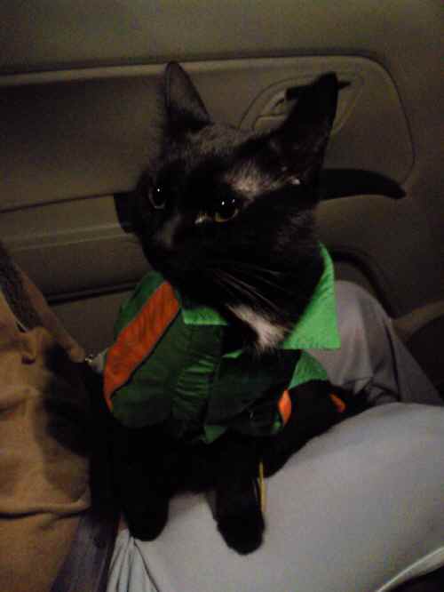 写真のぽるは雨のため、レインウエアを着ているぽる。