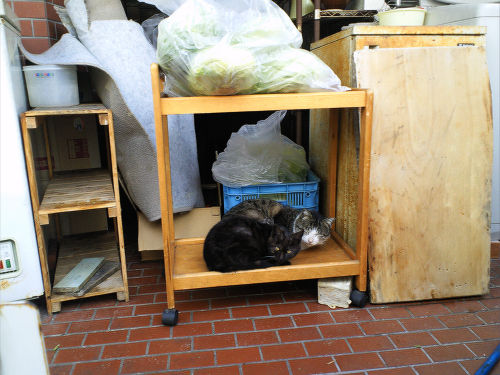 野菜やらが置いてある棚?の下段に3号とたくつが寝ていました。