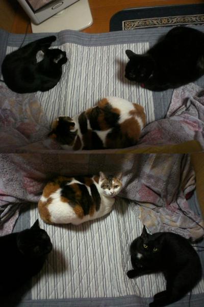 ミケ子を真ん中に黒い大小が左右に配置され、見事な三角形のできあがり~。