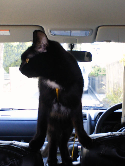 荷物を積み込むために開けっ放しにしていたら、フロントで寝ていたぽるが運転席と助手席のシートの間にスチャッと乗りました。