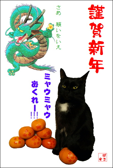 ぽると写真を撮ってフォトショップでトリミングして、神龍の画像をネットで拾って、ぽると神龍のセリフと賀詞をそれっぽいフォントで作って、組み合わせて完成☆