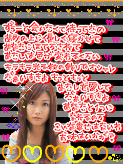 あはは-…あ-あ。何今日ゎ友達と勉強してきた-! 多分また勉強しに行くね-わら最近遊ぶって言うと勉強しに出かけてばっかで何か嫌やんね-勉強に縛り付けられてるしーわら今日お祭りだったのに-途中まで行けたのに-帰ってきちゃったしね-行きたかったしねーもう!!いきて-。しょうがないヵら今歌ワラ見てるしねカトゥーンが新曲歌ってまーす。 docomoのCM歌ってます-わらあれ借りようヵな-どーしよっヵな-。最近聖にめっちゃ好感もってんですがーわら あの頭が良いねっ!!てゆか、ドラマの役にもあってるし? イケルってー。でもまぁーうちゎサラサラヘアーでかっこいい方が良いヶどね-わらまぁだヵらって赤西君とヵがめっちゃ好き!って訳でもないヶどねー。はーい。語った。わら カトゥーンで思った-月9に亀梨クン出てんだよね-伊東美咲さんと-。この前見逃してめっちゃ悔しかったしねっ あ、中丸答えろーわらてゆーか、そんな答えゎねーよ。わらいつJJ買い始めようヵなぁ-。あれ大人っぽいからまだ買えないんだょね-。見てたヶどね-えみちぃとかすっごい大人やしね! もう憧れるね。あの足の長さと体型。あんな風になりたいわー笑 ムリやヶど。あれだよ!それをいっちゃーおしめーよぢゃねぇの?笑ごめっ。こんなん知ってたくない!わらあ、違うかも。 何だろー。近い!やっぱ、↑のあれだよ。 自信あるし!いえーい!当たったよー! 当たりたくなかったなー。わら