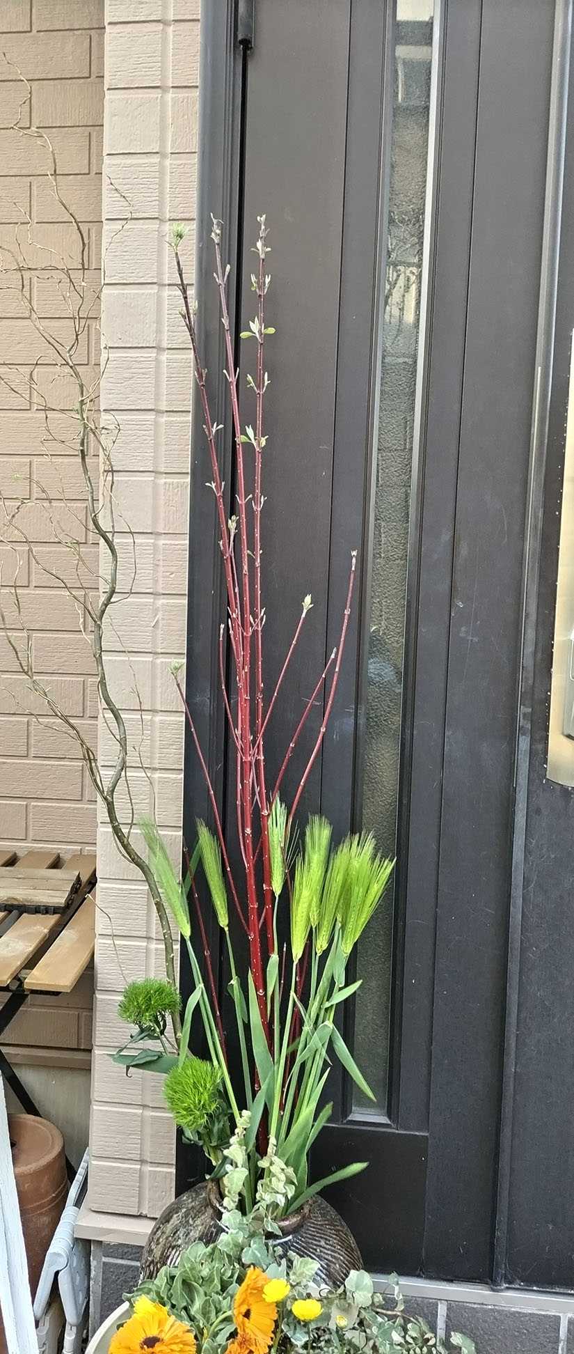 紹興酒の壺が眠っていたのでサンゴミズキ・雲龍柳とナデシコ・麦を挿して玄関先に・・・