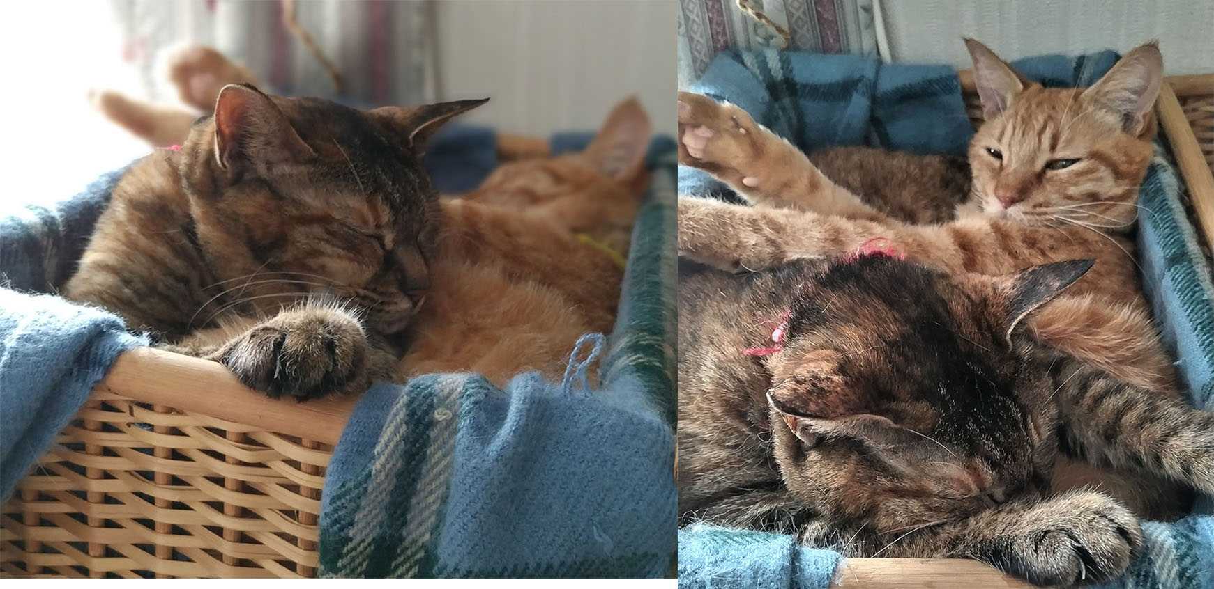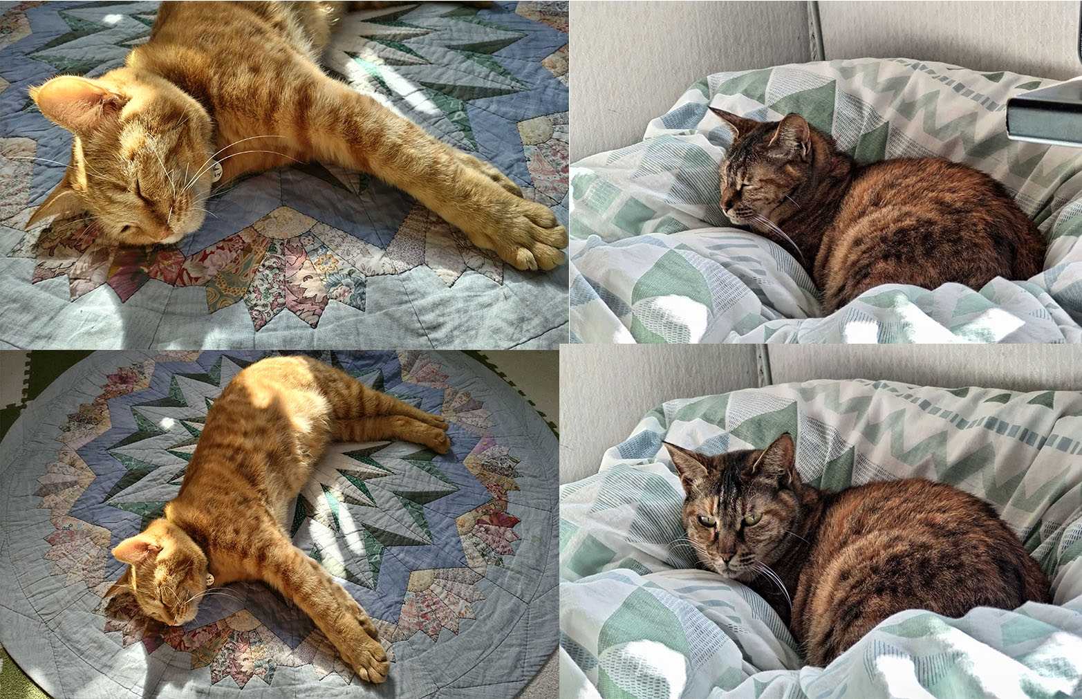 くうちゃんはマットの上、りんちゃんはベッドの上で日向ぼっこしていました