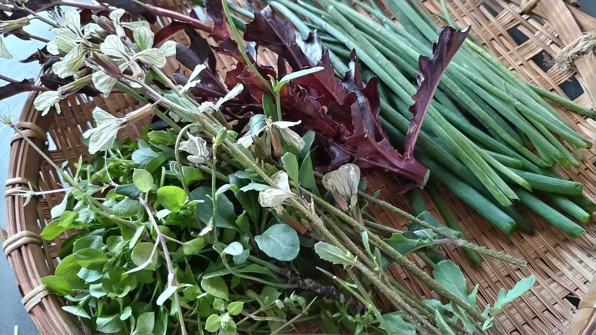 今日の収穫 ベランダから分葱・ルッコラ・レタス  裏庭からハコベ