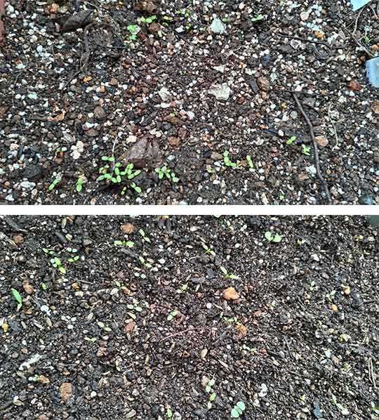 (上)筋蒔きしたほうれん草と春菊  双葉が出たら間引きしてあげよう