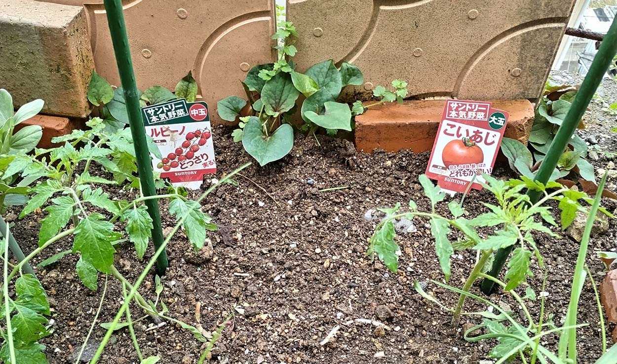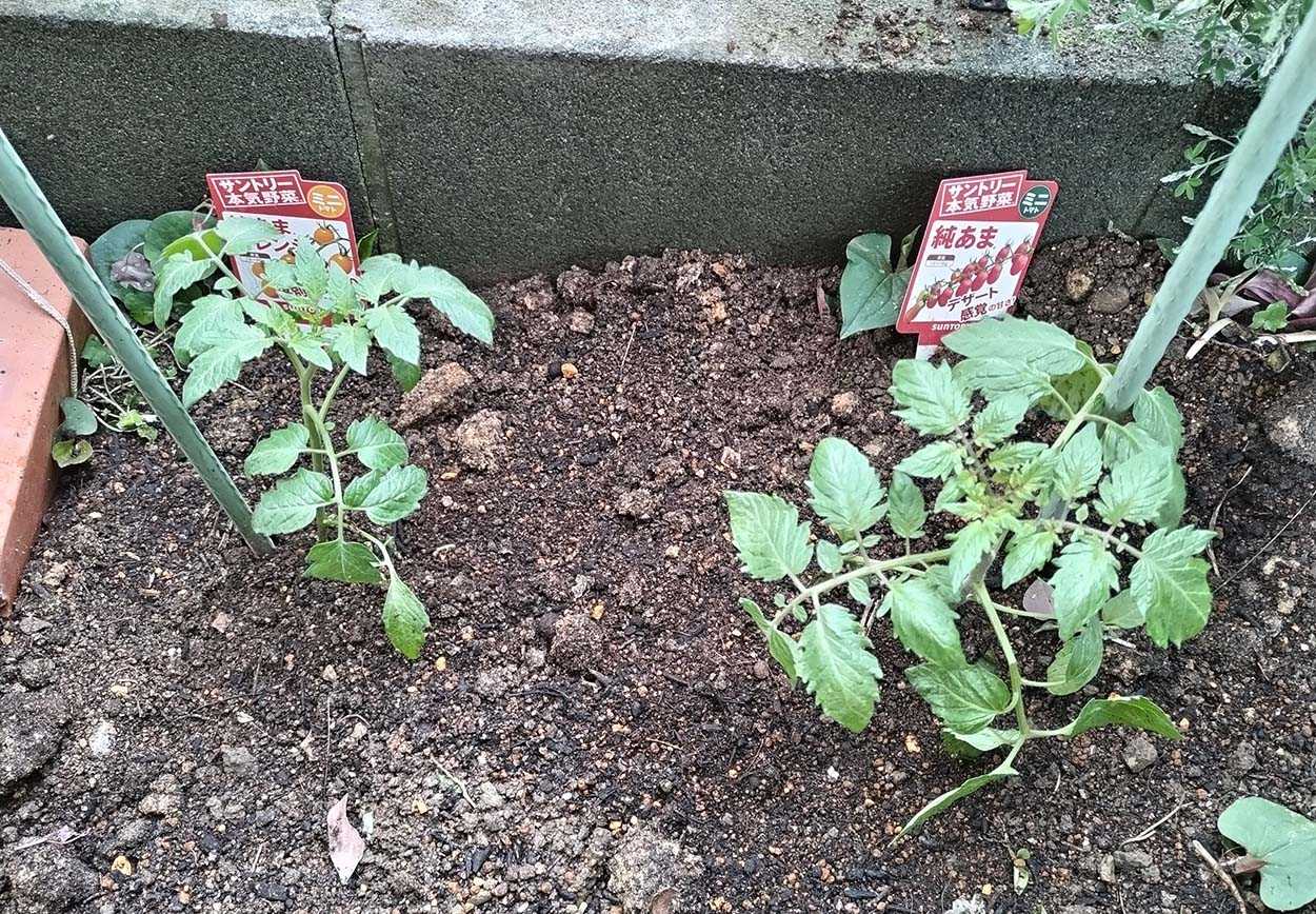 昨日植えたミニトマト(純あまオレンジと純あま)