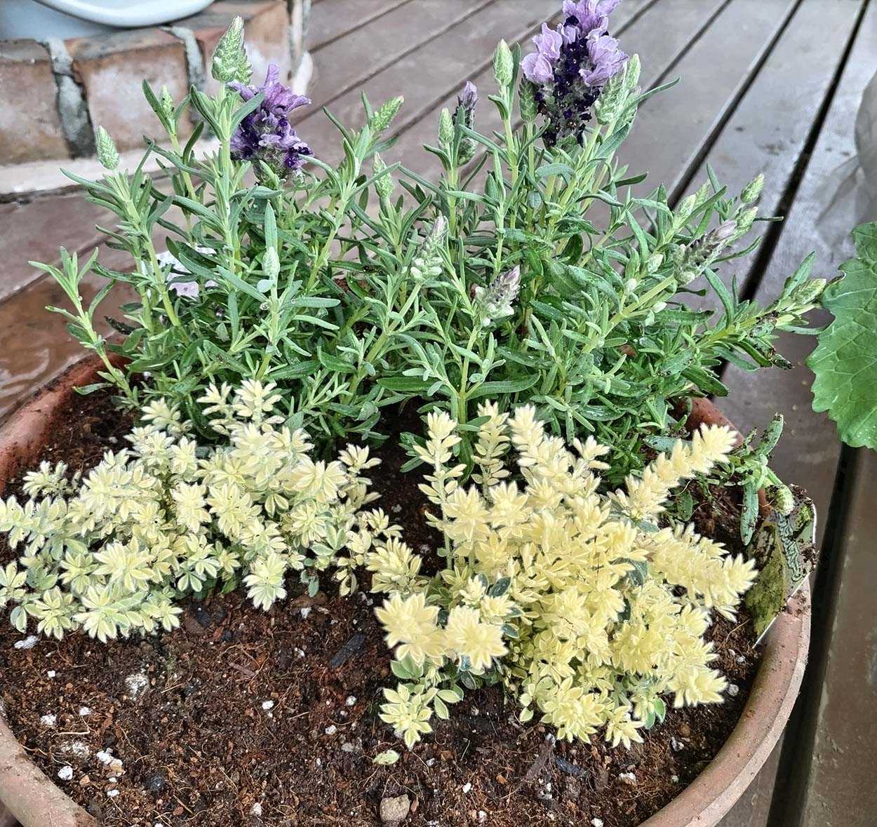寄せ植えはフレンチラベンダーとロータスブリムストーン