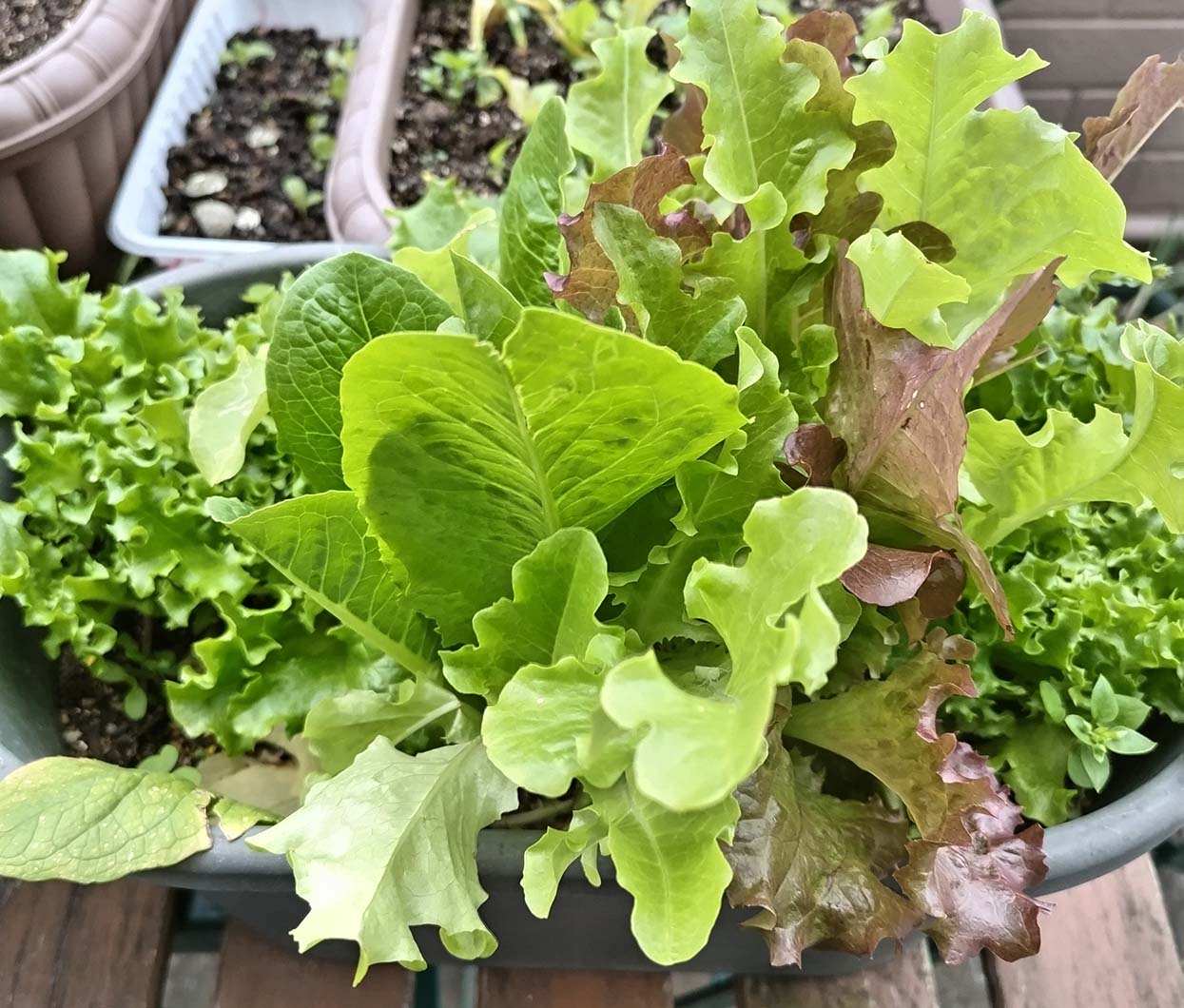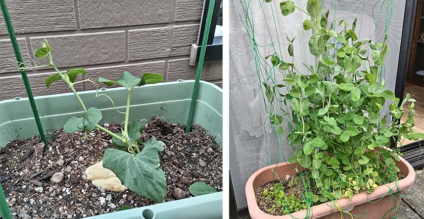 ハヤトウリを2階に移動してきた          豆苗も大きくなってきました