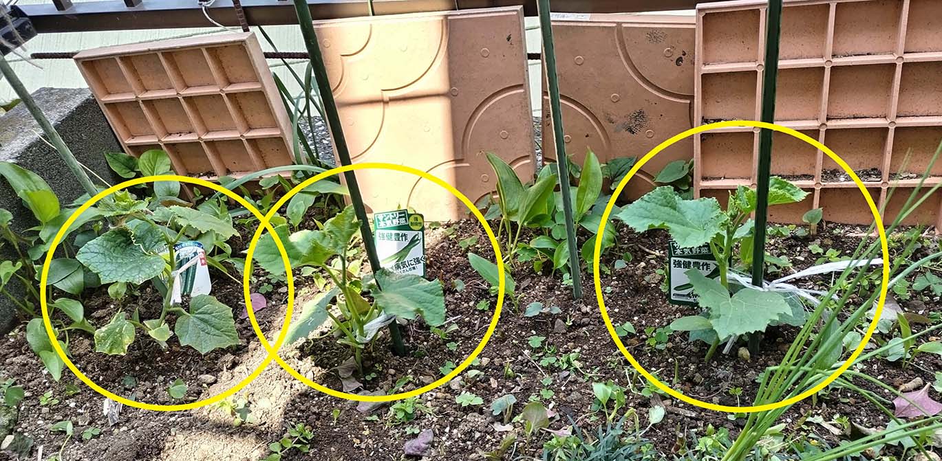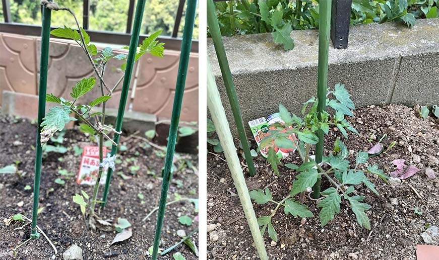 胡瓜 右2本は4月10日に植えたもの       左のは22日に植えたもの