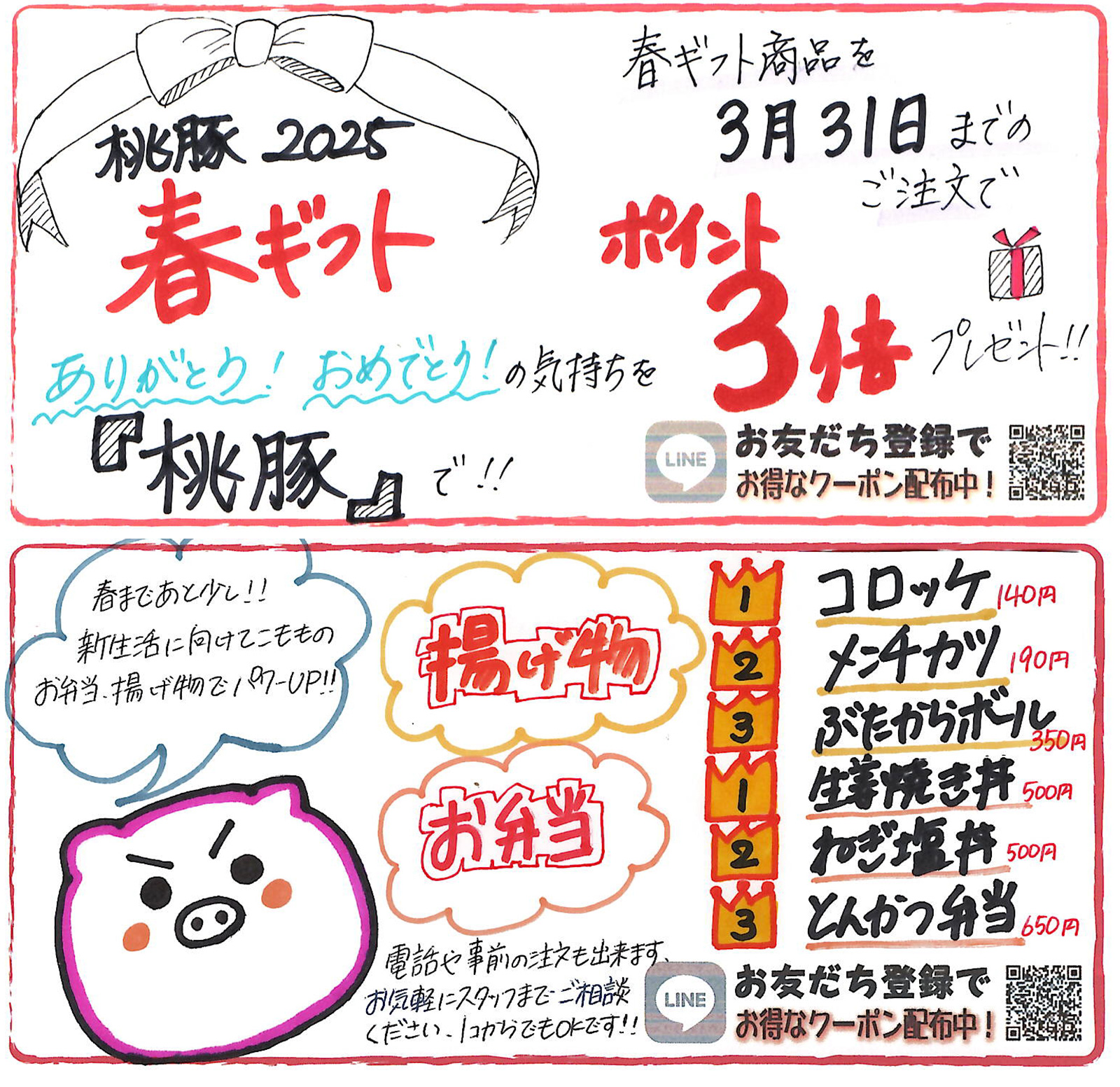 みなさん、こんにちはご卒業おめでとうございます高校の合格発表も終わり、もうすぐ入学・入社のシーズンですねさて、当店ではありがとう・おめでとうの気持ちを桃豚で【桃豚の春ギフト」好評発売中ですこもも小坂店・十和田店で3/31までご購入でポイント3倍ですこもも小坂店のお惣菜・お弁当の人気ランキングのご紹介No.1コロッケNo.2メンチカツNo.3ぶたからボール春まであとわずか!こももの揚げ物でパワーアップ電話や事前予約のご注文ができます。お気軽にお申し付けくださいさて、今月の肉の日は3/29(土)この日はポイント10倍ちょうど週末です。家族みんなで桃豚でにぎやかな食卓をお楽しみください