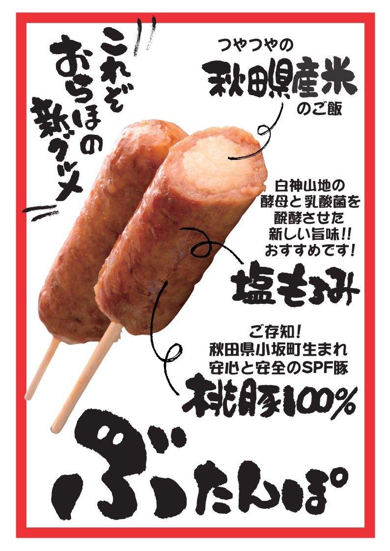 秋田名物の「たんぽ」をヒントに、 自社農場産の 「桃豚」 や「秋田県産米」、「塩も ろみ」で開発した秋田素材のファーストフード です ぺろり
