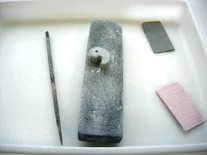 見た目以上にやわらかい石で、どんどん削れちゃう勾玉の内側のカーブを削るのが難しいある程度形を整えたら、細かい目のヤスリで表面をつるつるに磨くのですが、 石がやわらかいので、ちょっと爪が当たっただけでもすぐに傷がついてしまい、扱いが難しかったです