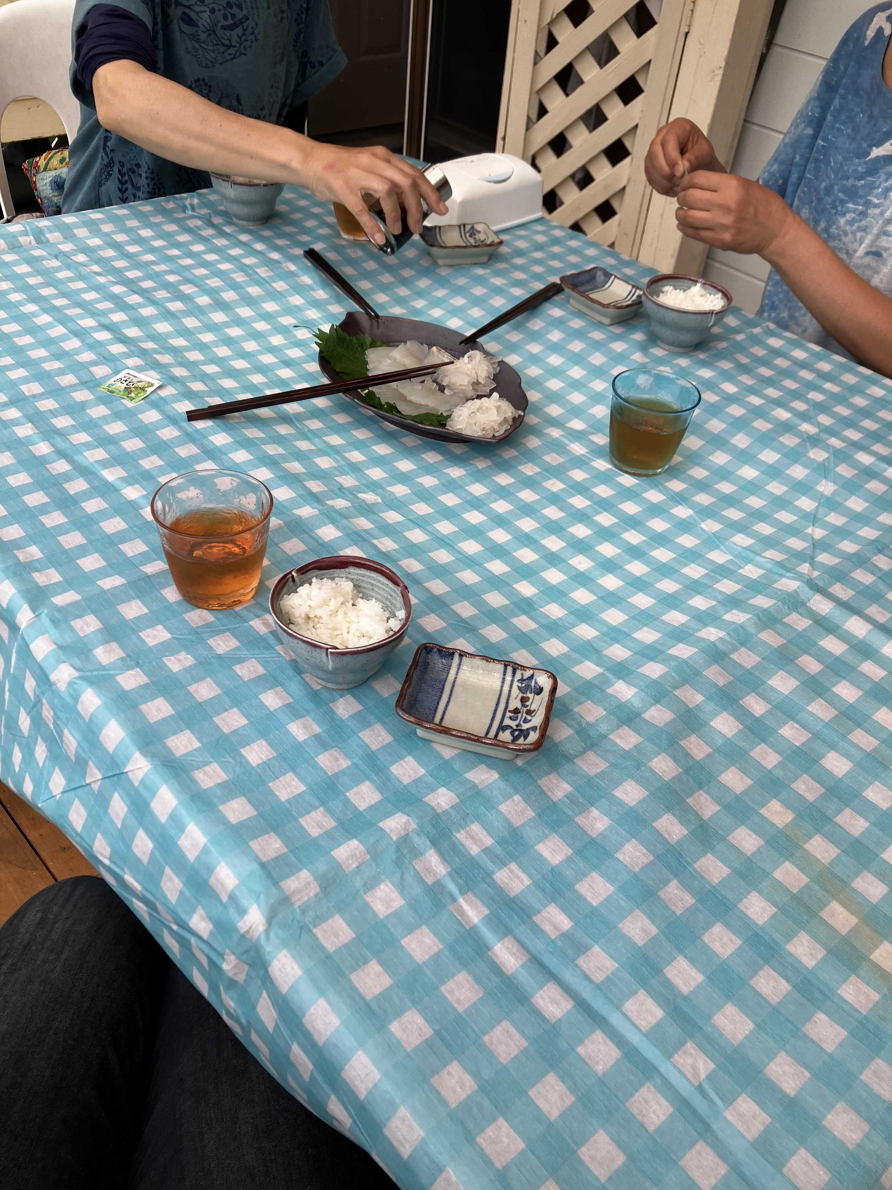 テラスで気持ちの良い風と新鮮イカ刺しと鯛めしをいただく。。。