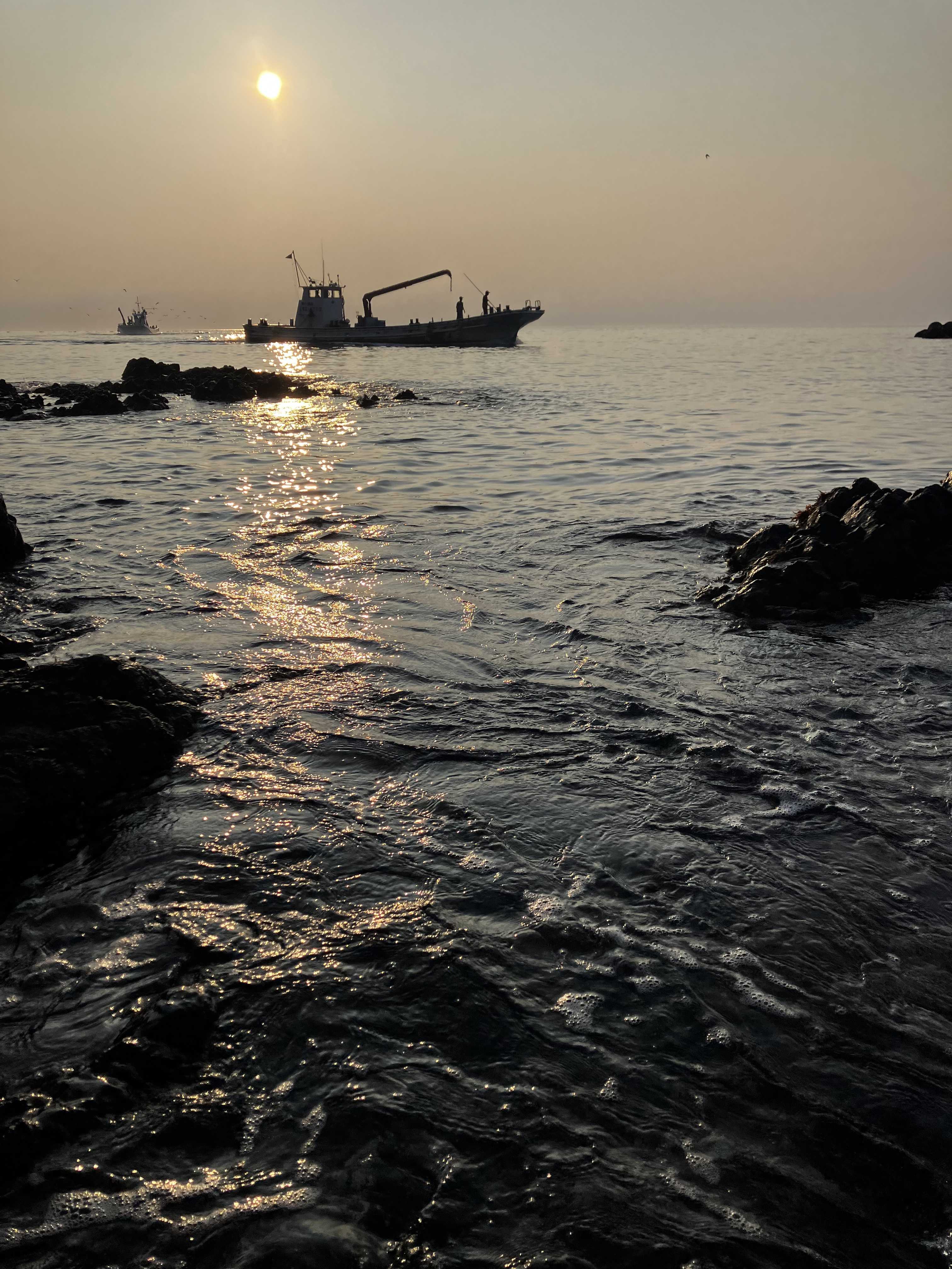 朝日が漁船を照らす