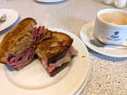 7月1日、またまたサイラーでランチ♪福岡空港に着いてレンタカーで直行した。これはルーベンサンド♪バターを塗ったヴァイツェンミッシュブロートに、ソース(ピクルス、セロリ、赤玉ねぎ、マヨネーズ、ケチャップ、チリソース)、パストラミビーフ、ザワークラウト、エメンタールチーズをサンドしたホットサンド。色々美味しそうなサンドイッチがあるけど今回選んだのはふたりともこれ。やっぱりパストラミビーフの質がよくないとこんなに美味しくはならない。たっぷり入ってるザワークラウトもパストラミを邪魔しない味付けでとっても合う♪♪前にも食べたことあるけどやっぱり美味しかった♪