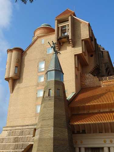 正面の両端に聳える塔にはバリー・フラナガンのうさぎ。