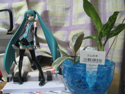 植物置いてみました。最近のは便利ですね。半年水をあげなくても保水ジェルが常に木に水分供給してくれるんだって。実はこの植物3代目なのです。初代は大粒の砂をガラスコップに入れて育てたんですが、水はけが悪かったのか数ヶ月すると根にカビが生えてきて葉が枯れてしまいまして…反省しました。で、反省を生かして2代目は正統派の土にしました。が、水遣りが面倒くさくてですね…数日水をやらないとだんだん萎れてくるんです、でも水をやると1日後には元気になるという実に植物らしいやつでした。買った時より2~3倍成長して寿命で枯れてしまったんですが観葉としては結構持ったと思います。で、今回はゲルです。楽な上に綺麗です。そしてすべて100均でそろいました。とりあえず1年は生きてほしいなぁ