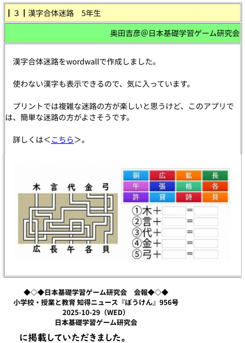 プリント「せんでむすぼう」を作成しました。 以前、作成したデータが見つからず、作ってみました。 F9ボタン(一部のコンピュータで作動しません)か数式から再計算実行で、画像や文章が入れ替わります。 2025年11月15日(土)データが一部破損していました。12月に入ってから、再度F9ボタンで画像や文字が入れ替わるものに修正する予定です。http://www.nextftp.com/okuda2024/sende-musubou.xlswordwallで プリントと関連した問題を作成しています。なにを していますか ?