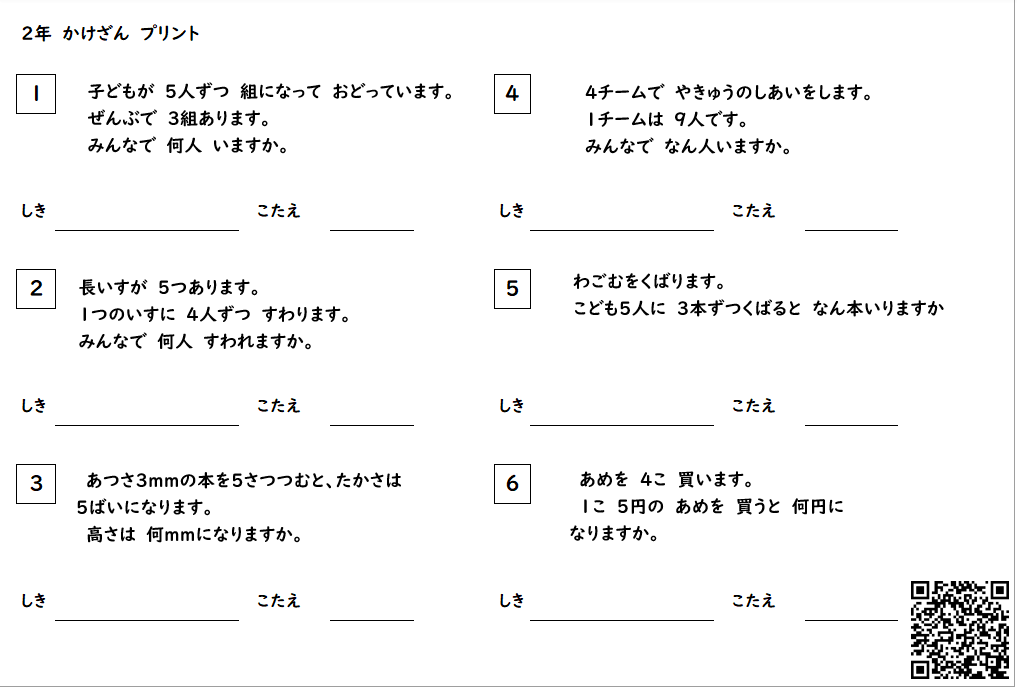 2年算数 かけざん しきをかきましょう以前、作成していたプリントにソフトにアクセスするQRコードをつけました。ダウンロードは→http://www.nextftp.com/printsoft/print2024.zip