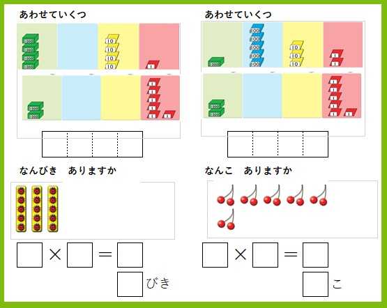 算数ソフトの画面を使って、フラッシュカードを作成(1)なんこ ありますか 下の問題では、4✖3になるのか、3✖4になるのかを おさえることが大切です。 そこで、フラッシュカードで学習できるようにしました。 はじめのうちは、式だけを答えればよいこととして繰り返し 学習するのがいいでしょう。 問題を少しずつ追加する予定です。2年算数 なんこ ありますか(2)あわせていくつ 筆算の仕組みがわかるようにフラッシュカードをつくって みました。 くり上がりのあるひっ算の練習にもなるような問題を追加 していく予定です。2年算数 あわせていくつ