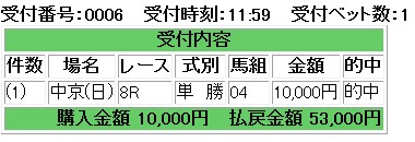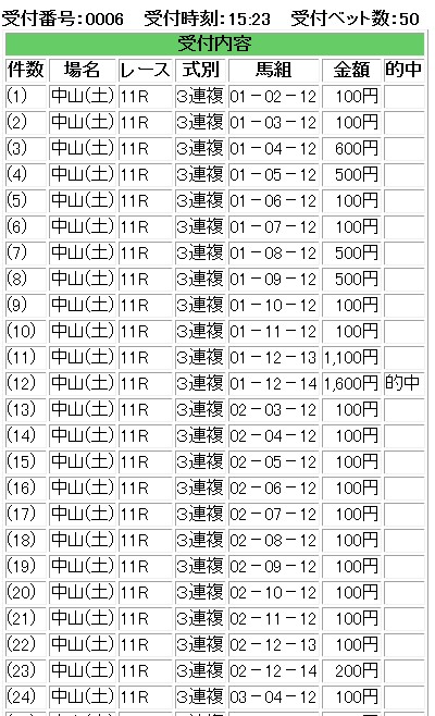さて・・・迷ってムスカテールの3連複総流しした。そうしたら・・・ようやくなんとか的中。フェノーメーノが伸びたのでヤバいと思ったが・・・もう一頭買いたいと思っていたカポーティースターが意外に人気が無くセーフ。連勝期待して中京の最終買ったら・・・ヘッポコ騎乗にやられたが・・・・まあ・・・後輩が挙げていた通り、フェノーメーノかあ・・・まあ・・・明日の後輩に期待かな・・・・Nスポ募集中です。2013年3月23日日経賞早速3連複に変えて良かったということなんだけれども・・・・この組み合わせでこれも厳しいよなあ・・・何となくだけれども・・・明日の後輩が熱そうなので結構期待している。IE・PC用自薦集http://plaza.rakuten.co.jp/puchihametu/34000↑IE・PC用自薦集(絞り込み)我が優秀な後輩君↑http://blog.livedoor.jp/longshotm/対価出した後輩の予想ページ↑http://doronuma2.blog83.fc2.com/後輩での一貫性勝負結果集http://plaza.rakuten.co.jp/puchihametu/15004↑後輩での一貫性勝負結果集