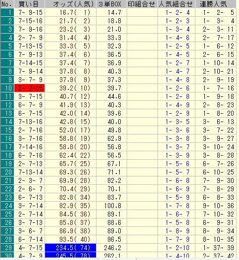 上記の画像分かるだろうか・・・・2013年3月17日の中山12Rのオッズだ。これまた見事なオッズの断層だなと思えるのだが・・・・・こう・・・なんか理論が確立されたのかな・・・何番人気以下はほとんどこないというか・・・麻雀の先行リーチはカンチャンでもOKみたいな・・・12番人気以下はほとんどこないといった・・・まあ、すごいな・・・皆・・・・で・・・昨日改めて考えたのだけれども・・・3連複で全通り買う場合と、3連単で全通り買う場合・・・点数は6倍違うのだが・・・・合成オッズ上は3倍違うかどうかだと思うのだ。で・・・・逆にいえば・・・3連単と3連複で・・・合成オッズに3倍差がつかなければ・・・・3連複の方が有利ということ。てことはだ・・・3連単で合成オッズ20倍と・・・・3連複で合成オッズ7倍では・・・後者の方が有利だと言う事。3連複の的中率は純粋に考えて総流しという発想で考えれば3連単の3倍のはず。てことは・・・3連単が有利になるには・・・3連複の合成オッズの3倍以上つかなければならない。だが・・・上記のオッズを見てもそうだけれども・・・オッズの断層というか・・・・差が激しくなり・・・3連単に皆ソフトを使用して参入しているため・・・3連複の方がオッズが甘くなり始めている。これは・・・こちらにシフトすべきかなと思えてきている。合成オッズを3連単と3連複・・・やってみて的中率も考慮して考えたいが・・・3連複の的中率・・・3連単の3倍以上になるのではないかと思っているのだ。総流しだとしても・・・・というのも・・・競馬における1着は実はかなり難しい。2~3着は言うほど難しくない。そう考えると・・・3連複の1頭軸にした場合・・・・的中率が3倍以上になると思えるのだ。頭に人気薄が来てもいいと言うのがそそる。これは・・・パラダイムシフトが必要になってきたのではないかと思えるのだ。さて・・・再度来週考えよう。今日はサンマーで・・・完全なるプラマイ0。いつも通りスロースターターだったが・・・チップのレートを下げて泣いたパターン。だが・・・負けなくなってきた。ギャンブルを理解し始めたと言えるんだろうな・・・・競馬も・・・さらに前進を・・・今週はG1間違いが起こる事に期待したい。