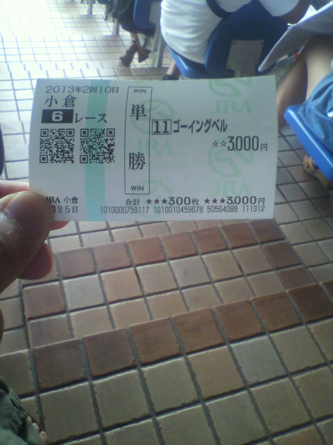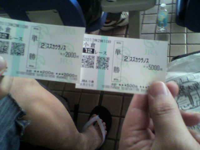 さて・・・昨日はオフ会に参加してくださった皆様ありがとうございました。おかげで楽しい夜を満喫できました。またよろしくお願いします~詳細は帰宅したら書きます。はやとぅさんのヒキに酔いしれる一日でした。さて・・・競馬・・・・紙の馬券が1枚も当たらなかったので・・・・今日も果敢に購入。後輩の予想を見て、レートを落として購入したけれども・・・・落としたのが失敗小倉6Rゴーイングベル 単勝でもって・・・何故か東進ハイスクールの林先生が来ていた。今でしょとか言ってたやはり・・・なんか新潟の最終で黛とか二本柳とか西田を買う人と話が合うそうです。絶対馬券負けているよな・・・・さて・・・・小倉7Rに・・・いつか走ると後輩が言っていた馬が出走していたので軽く購入。不良馬場だったことも含めて見事逃げ切りだが・・・・推しレースではなかったので控えめにしたら・・・本当に50K回収で組んでちょっと上ブレ・・・ううむ・・・・もう少しつかないときついよね・・・・2013年8月25日 小倉7R ヤマニンシュリル?さて・・・この後も何かが起きること期待だな・・・我が優秀な後輩君↑http://blog.livedoor.jp/longshotm/対価出した後輩の予想ページ↑http://doronuma2.blog83.fc2.com/後輩での一貫性勝負結果集http://plaza.rakuten.co.jp/puchihametu/15004↑後輩での一貫性勝負結果集